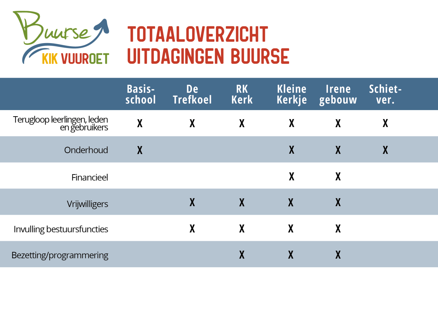 Hierbij is gekeken naar de gebruikers, het onderhoud, de financiën, de vrijwilligers, de invulling van bestuursfuncties en de bezetting en programmering van de accommodatie. Ook is inzichtelijk gemaakt welke wensen en uitdagingen de accommodaties voor de toekomst hebben.